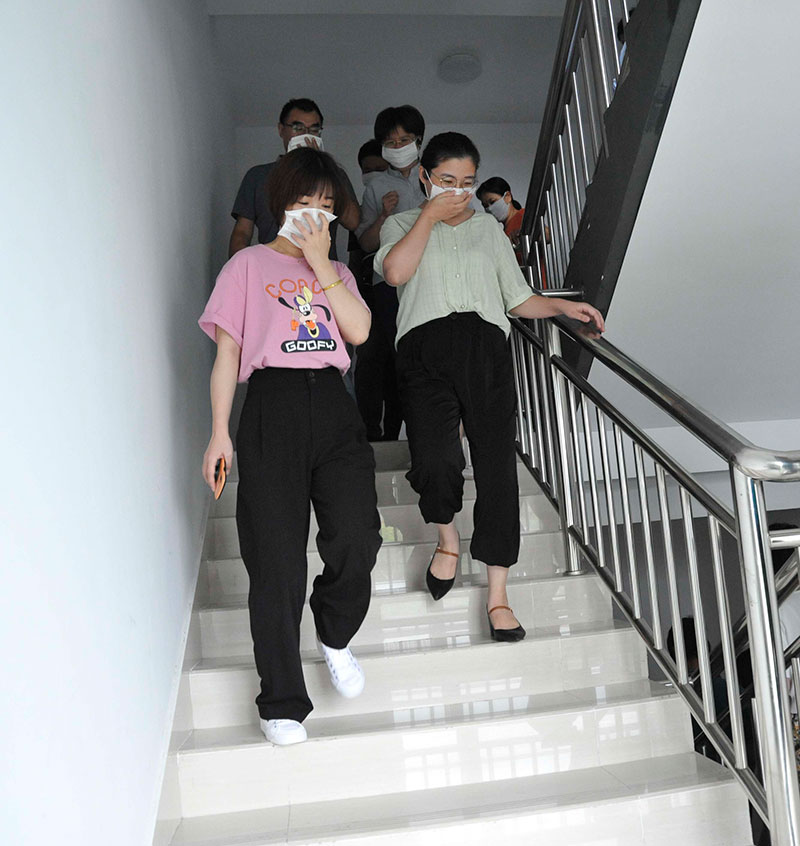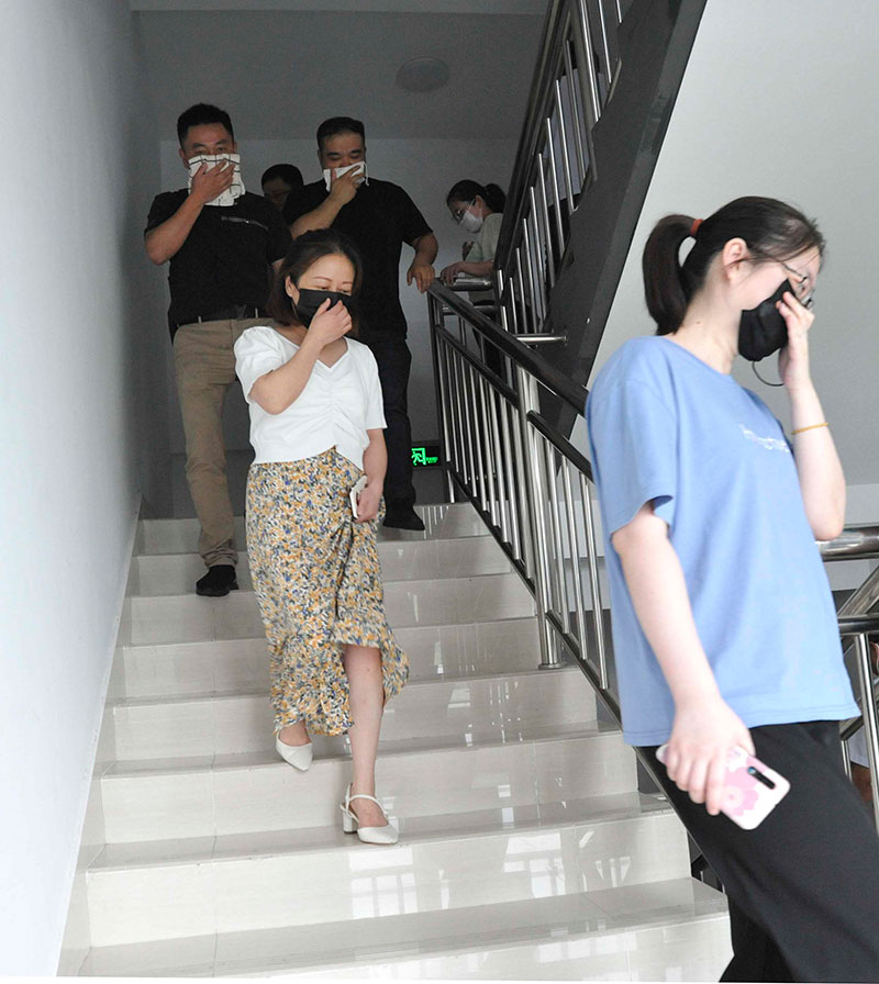 演練中,隨著總指揮指令下達(dá),消防警報響起,樓內(nèi)所有工作人員迅速、有序撤離,以最快的速度全部疏散至安全區(qū)域。