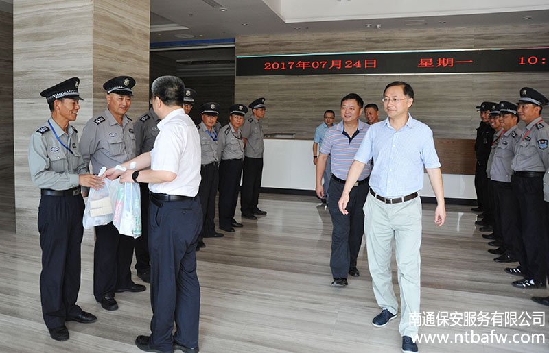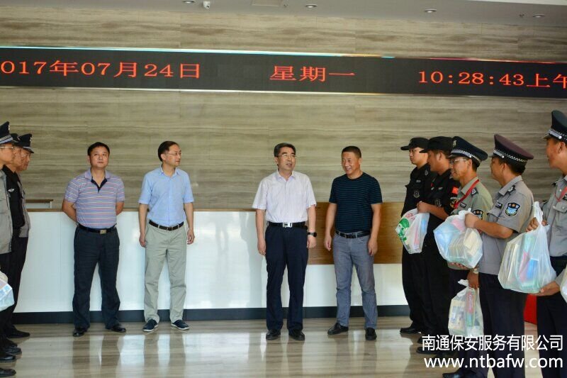7月24日上午,城建集團董事長李維賢、副總經(jīng)理施焱、朱峭嶸在公司董事長沈鑫華等陪同下,慰問了冒高溫堅守一線崗位的保安隊員,送上了防暑降溫用品。